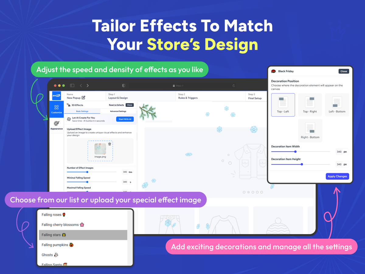 Fully Customizable – Adjust animation speed, density, intensity, and visibility across specific pages or your entire store