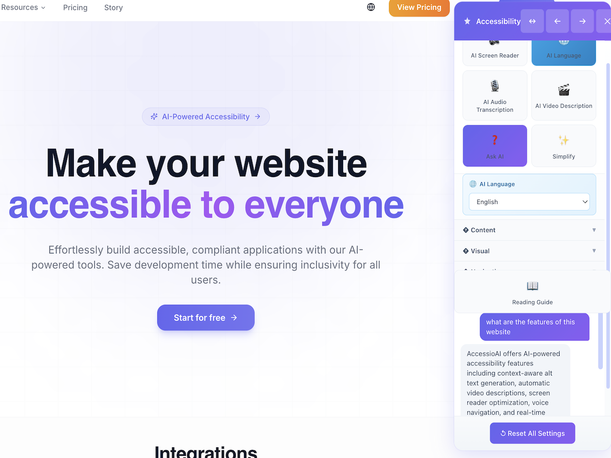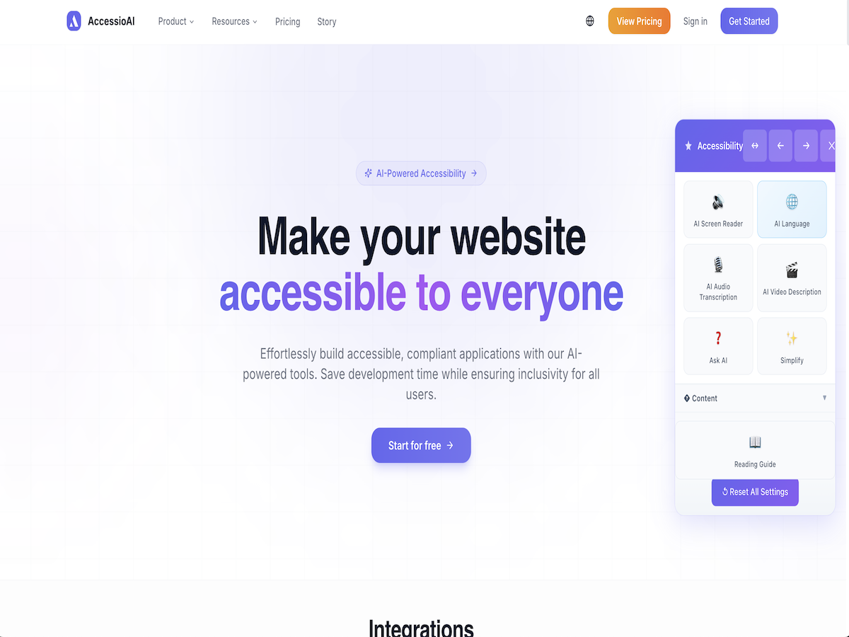 Accessio.ai is an AI-powered website accessibility solution that ensures full compliance with WCAG 2.1 (AA/AAA) and ADA standards. What the App Does It installs via a simple JavaScript snippet and provides: - a customizable accessibility toolbar for users to adjust site appearance (e.g., font size, contrast, reading guides). - AI that automatically scans, detects, and fixes accessibility issues, including alt text generation, ARIA enhancements, and keyboard navigation—rescanning every 24 hours. The Problem It Solves Most websites are not fully accessible to people with disabilities, creating barriers for 15-20% of users. Manual fixes are expensive, slow, and break with site updates. What Makes It Unique Unlike basic overlays, Accessio.ai uses advanced AI for deep, contextual remediation that adapts to dynamic content automatically—no coding or ongoing manual work required. Why Add It to Your Website You can install it in minutes via the App Market or snippet. It works without altering site code, maintains compliance as content changes, and delivers true accessibility at low cost. Visit accessio.ai or the App Market for details.