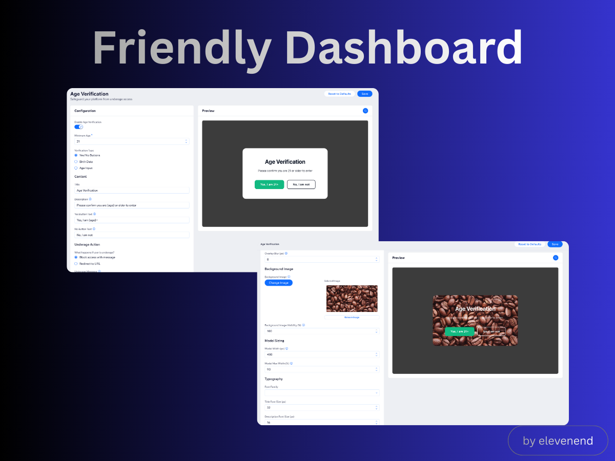 You can choose from multiple verification methods, including a simple Yes/No confirmation, a date-of-birth selector, or direct age input, making it easy to meet different legal and regional requirements. Premium users can fully customize the design by adjusting full design so the verification screen matches their brand perfectly.