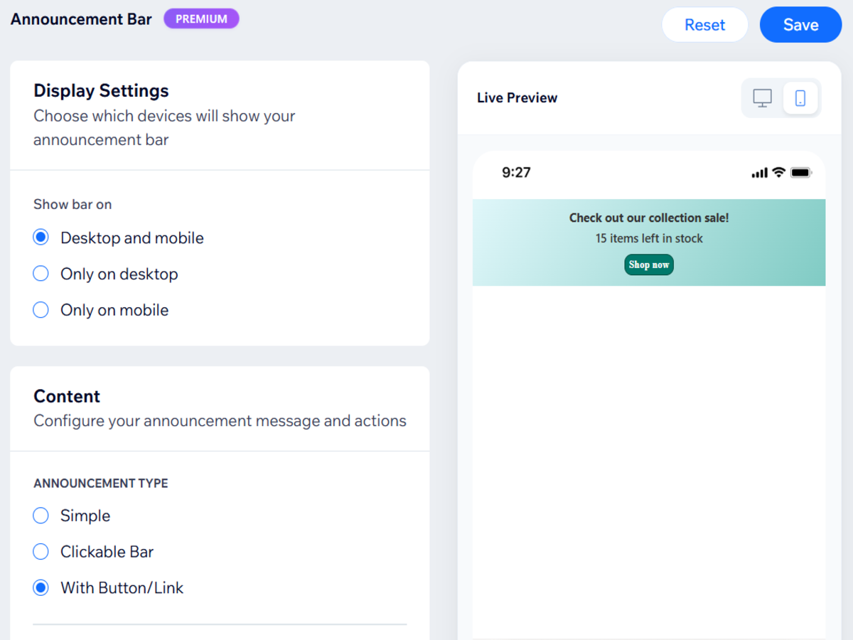 Create simple text bars, fully clickable announcements, or CTA-driven bars. Control position, sticky behavior, and device visibility, while customizing colors, fonts, spacing, and backgrounds to match your brand. The announcement bar is lightweight, fully responsive, and optimized for performance.