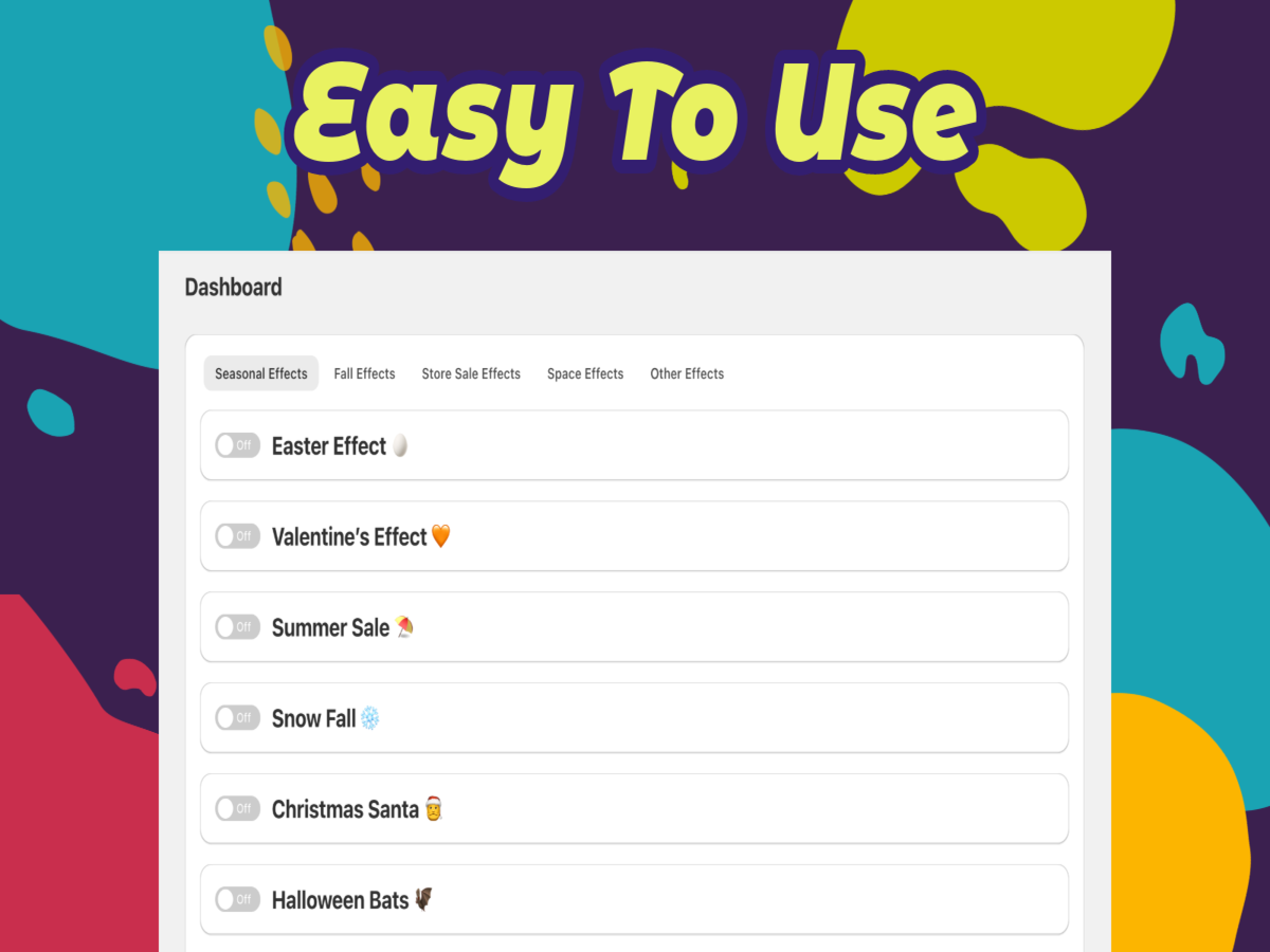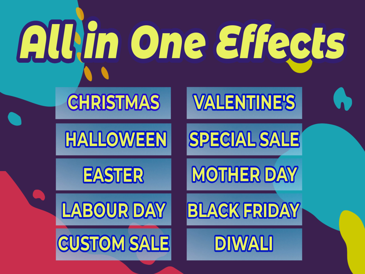 Dakaas Seasonal Effect allows you to create a cozy shopping atmosphere by adding animated magical & smooth Store decorations. Celebrating holidays and occasions in store can improve interaction with customers and enhance sales & conversions. We constantly add more effects like Winter Christmas snow fall, Easter, Valentine, Black Friday, Store Animation, Mother's Day, Spring, Heart fall, Christmas effect, thank you, Sale, Star, Firework, Halloween, Confetti, St. Patrick's Day, Ramadan & valentine.