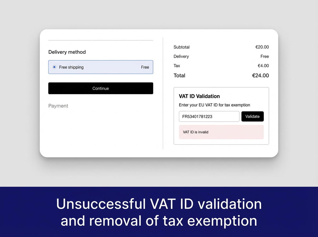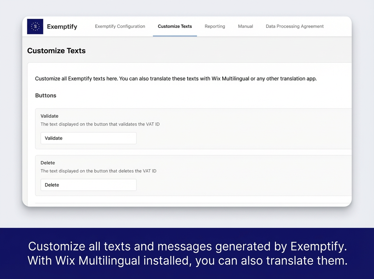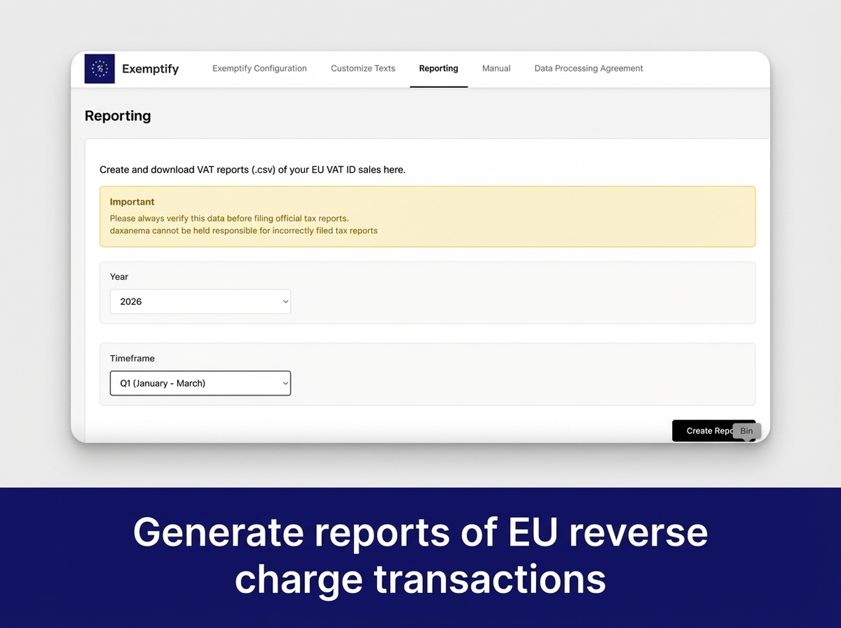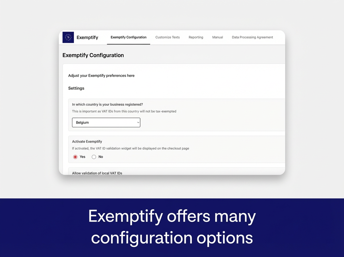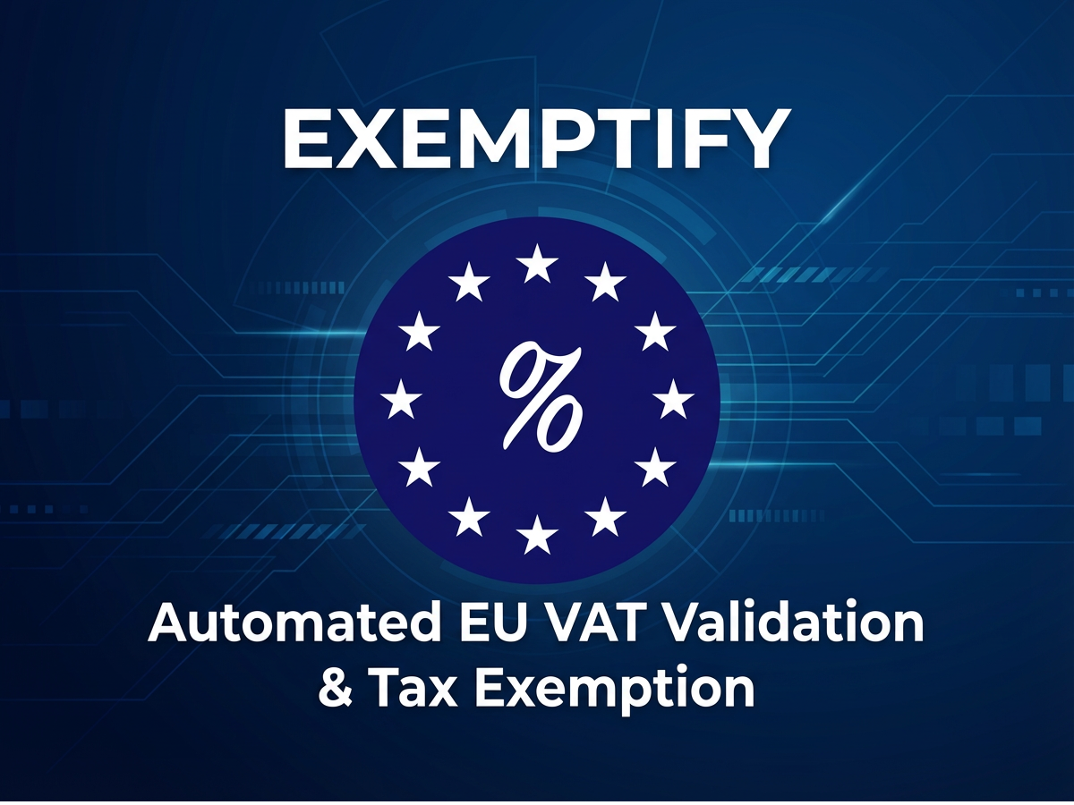 Exemptify automates EU VAT ID validation and tax exemption for B2B transactions within the European Union. The app validates VAT IDs at checkout and automatically applies tax exemption when a valid EU VAT ID is provided, enabling you to comply with EU reverse charge VAT regulations. Exemptify will automatically apply or remove tax exemption based on shipping country and VAT ID. Exemptify comes with a reporting view, that makes it easy to file your Intra-EU B2B tax reports. All texts and messages generated by Exemptify can be modified and translated.
