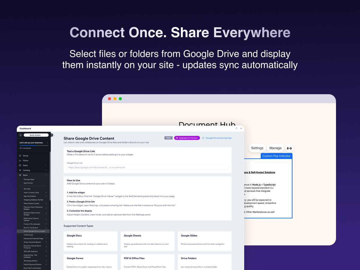 Simply paste a Google Drive sharing link into the widget's settings panel, and the content is embedded instantly. Your visitors can view Google Docs, Sheets, Slides, Forms, PDFs, Microsoft Office files, and even browse shared folders - all without leaving your site.