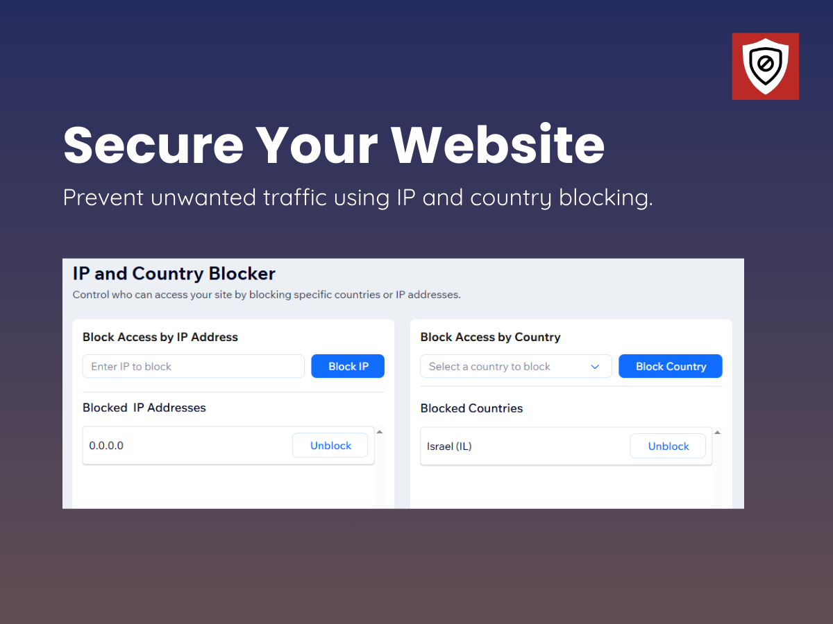 IP & Country Blocker gives you complete control over who can access your website. It helps you protect your content, comply with regional restrictions, and prevent unwanted traffic, all through a simple and intuitive setup. With this app, you can easily restrict access based on visitors’ countries using a straightforward selection menu. This is ideal for businesses that need to enforce regional licensing rules, content availability limits, or legal compliance requirements without complex configuration. You can also block specific IP addresses that generate spam, abuse, or suspicious activity. By filtering out unwanted visitors, you maintain a safer and cleaner environment for your legitimate users. Once your rules are set, the app works automatically in the background by checking every visitor and applying restrictions across your entire site. All settings are managed from a user-friendly dashboard that requires no coding, allowing you to enable or disable blocking rules with ease. Blocked visitors are shown a clear and professional “Access Restricted” message directly on your site, so there’s no need to create or manage additional pages.