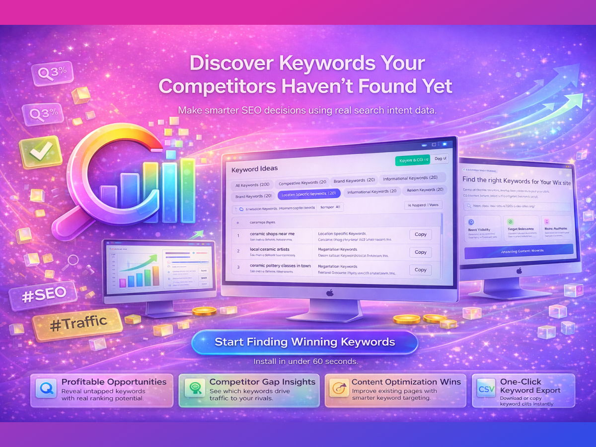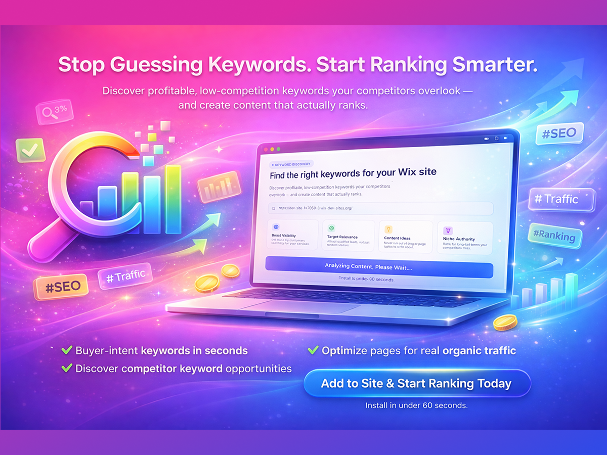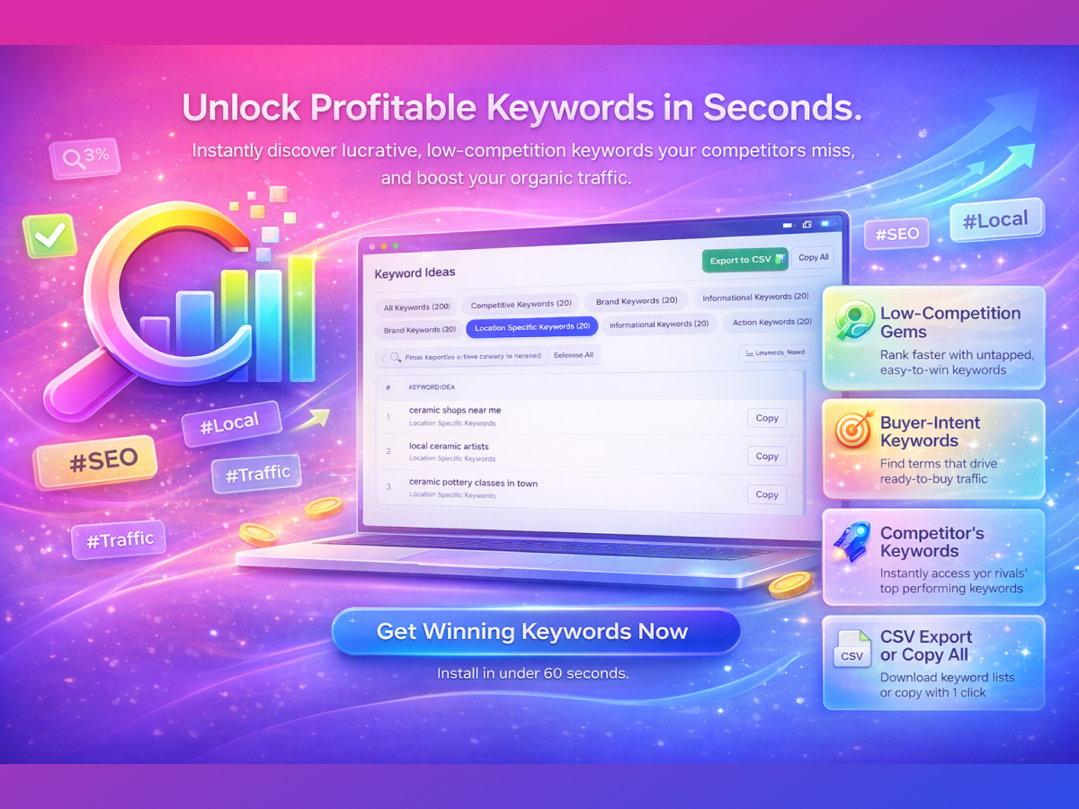 Stop guessing keywords. Start ranking smarter. 91% of content gets zero traffic because businesses choose the wrong keywords. Our app helps you instantly discover profitable, low-competition keywords your competitors overlook—so you can create content that actually ranks. Why most businesses fail without keyword research: • Content that never gets seen • Competitors taking your customers • Wasted effort targeting irrelevant terms • Missing new and trending opportunities What you get with our keyword finder: ✓ Buyer-intent keywords revealed in seconds ✓ Instant access to competitor keyword ideas ✓ Keywords to optimize your existing pages No complicated setup. Just pure keyword ideas delivered fast. Install in under 60 seconds and start uncovering keywords that drive real organic growth. Every minute you wait, your competitors discover opportunities that could have been yours. Click “Add to Site” and unlock smarter keyword decisions now.