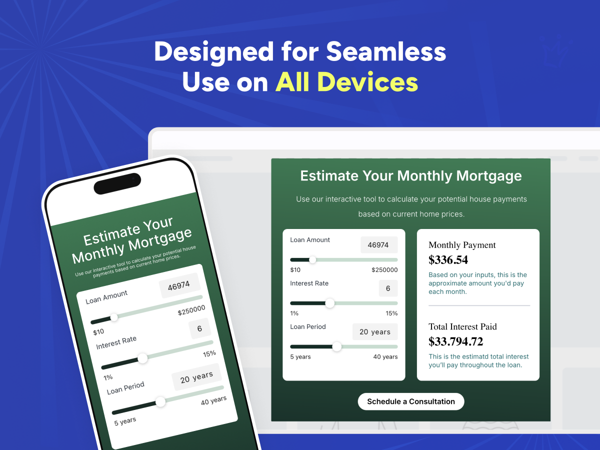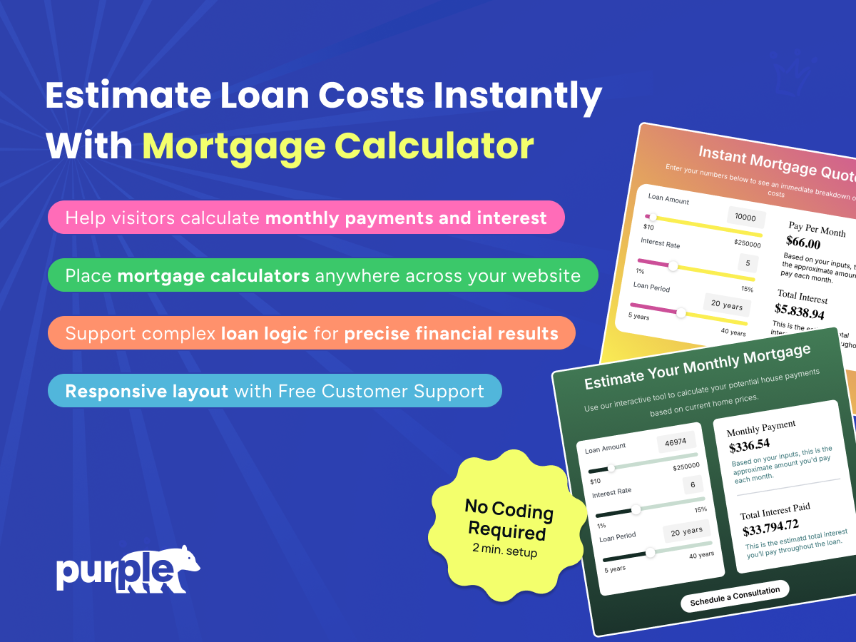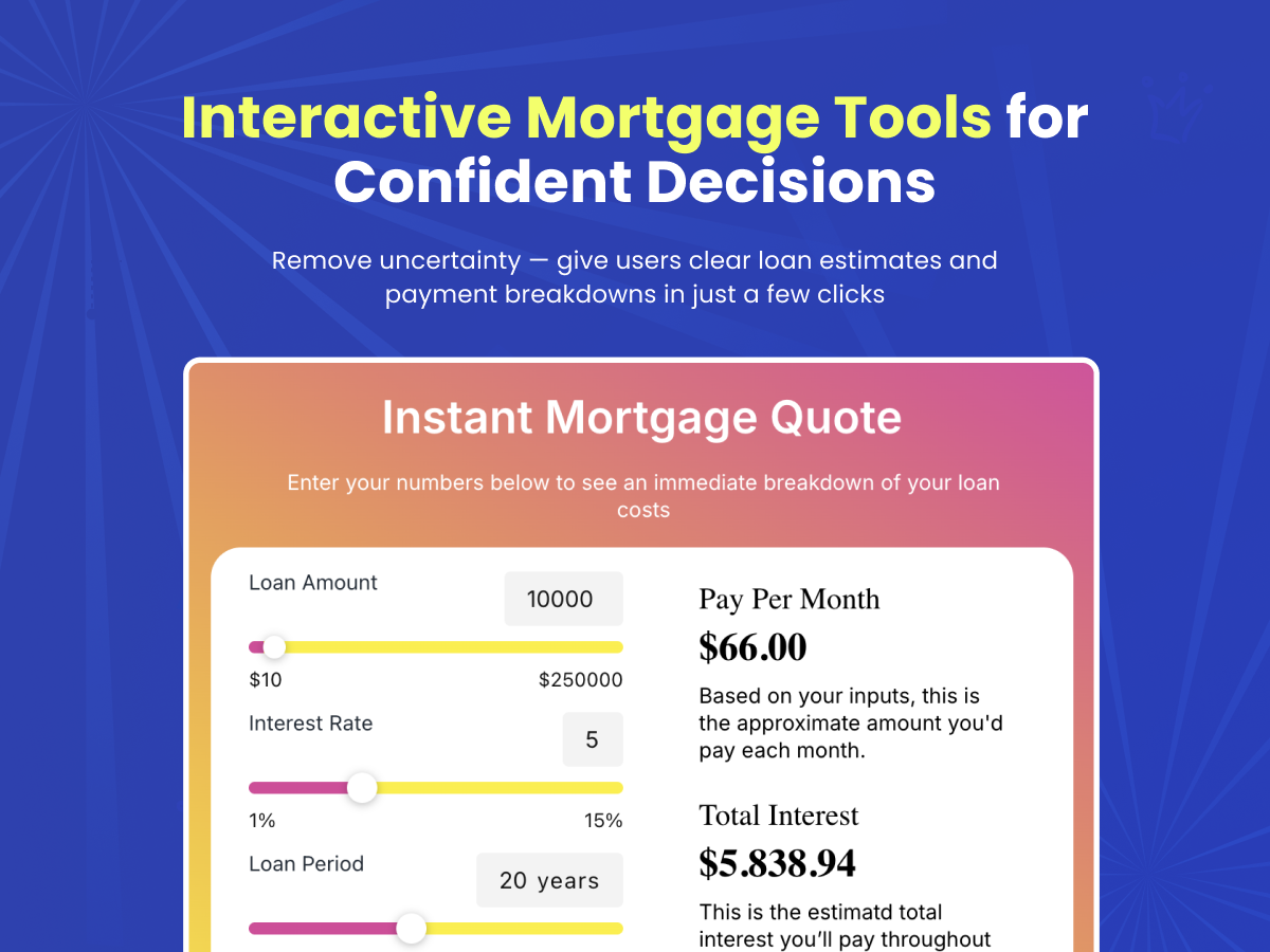 Help your customers understand their real costs before making one of life’s biggest decisions. Mortgage Calculator delivers clear, instant estimates directly on your website, allowing visitors to explore loan scenarios with confidence.
