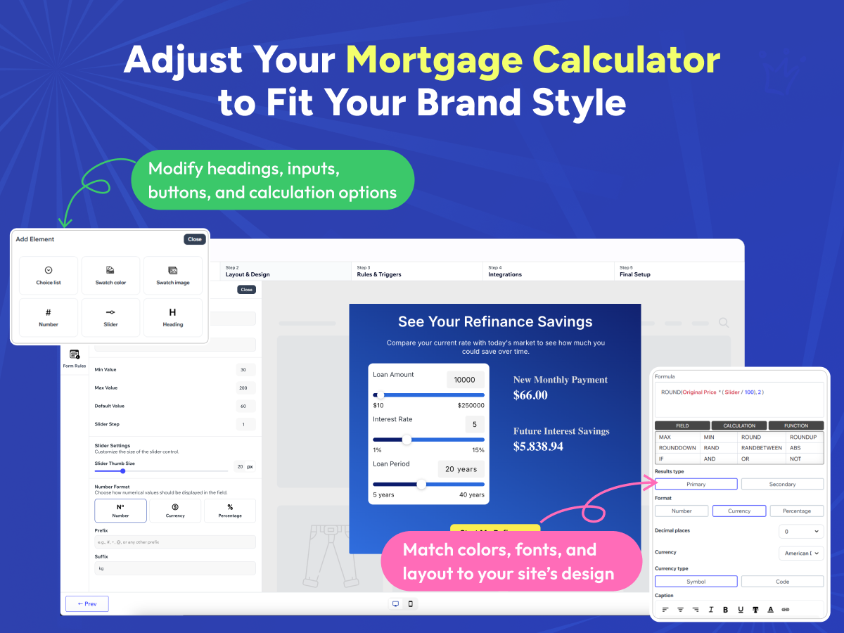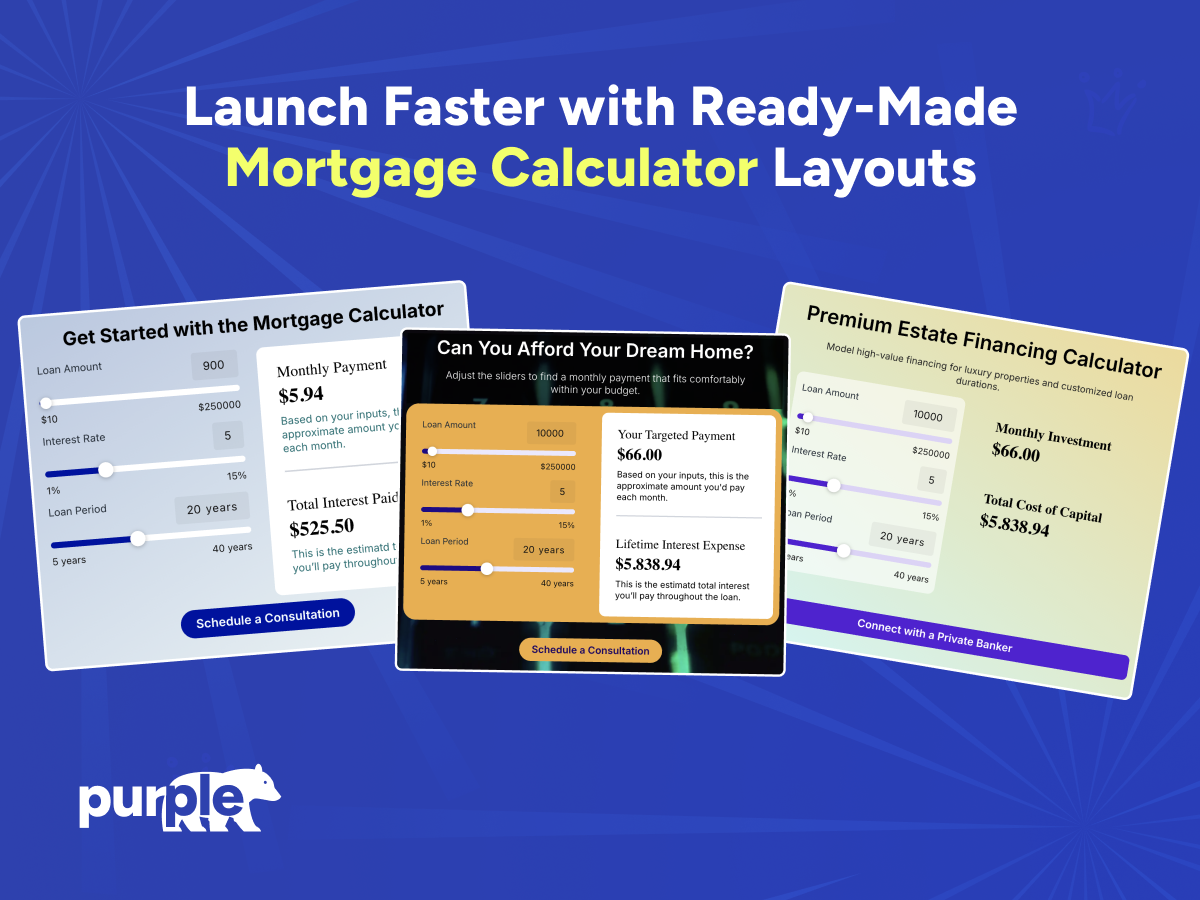 With real-time calculations and an intuitive interface, users can adjust loan terms, interest rates, and down payments to see exactly how their monthly payments change. The calculator is fully customizable, so it fits naturally into your site while providing reliable, easy-to-understand results that build trust and clarity.