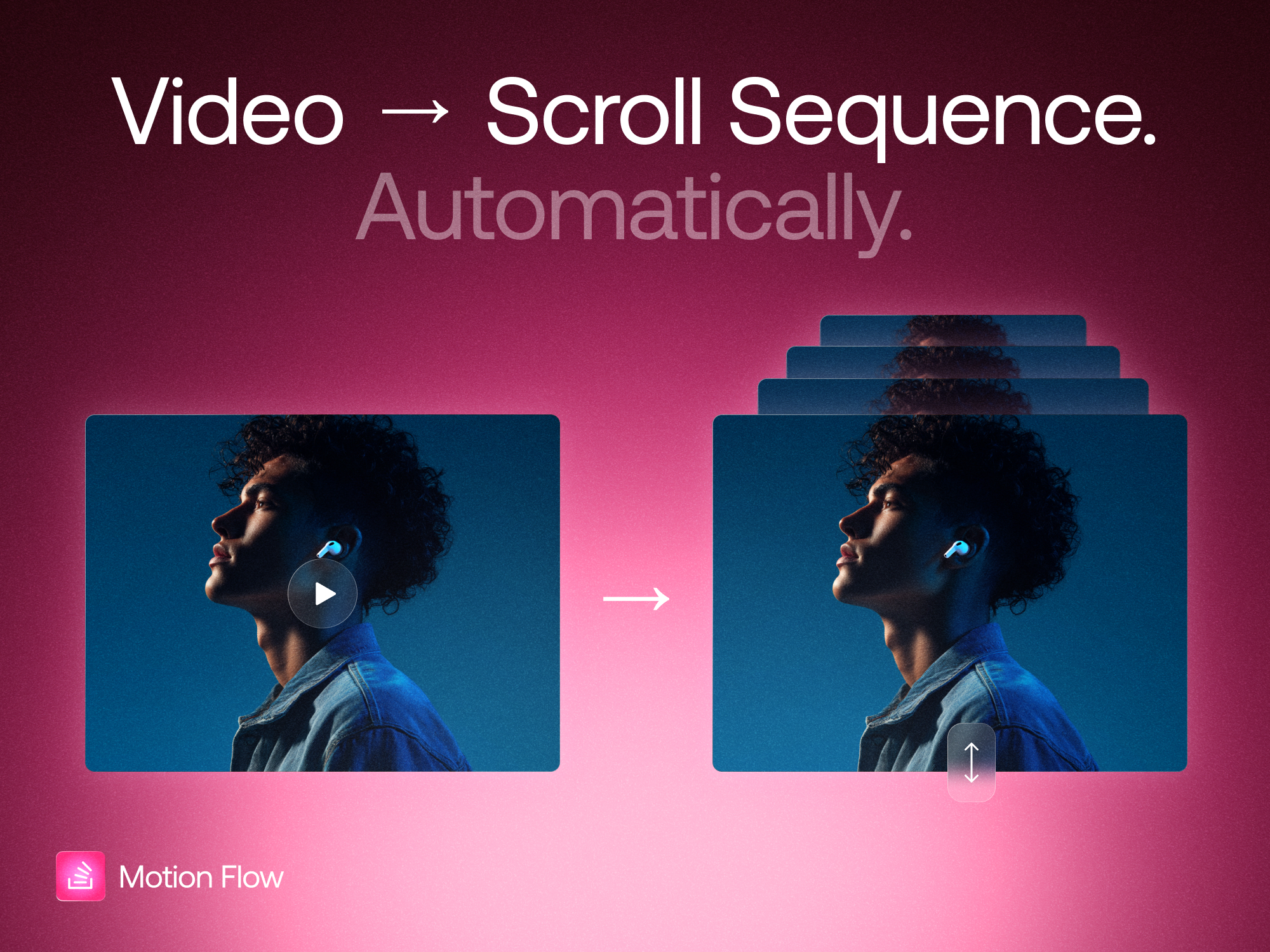 Create smooth scroll-based video experiences on your Website using just Drag & Drop. Just upload your video - or start with one of our animated templates - and Motion Flow automatically sequences, compresses, hosts, and prepares everything for flawless scroll-based playback.
