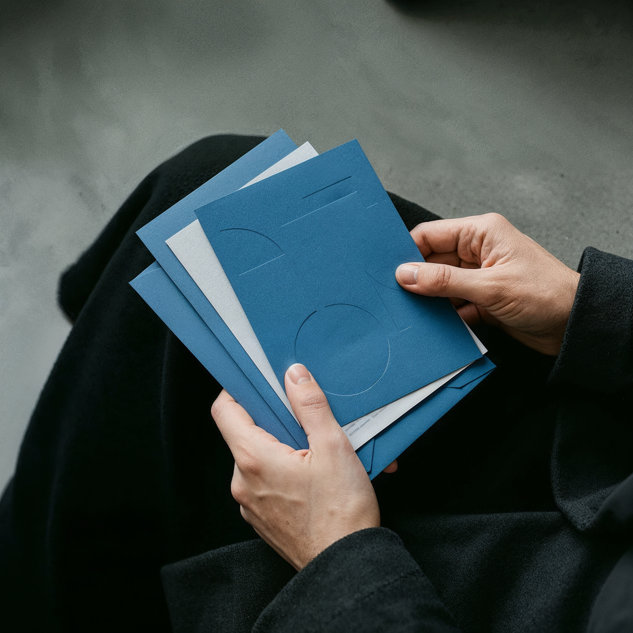 Business cards and brand collateral printed on FSC-certified and recycled stocks with vegetable-based inks.