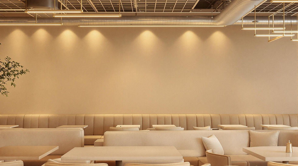 A commercial interior for a downtown cafe designed to attract a trendy clientele. The space mixes cozy seating arrangements, innovative metallic light fixtures, and a warm neutral palette to create a chic yet inviting atmosphere, elevating the dining experience.