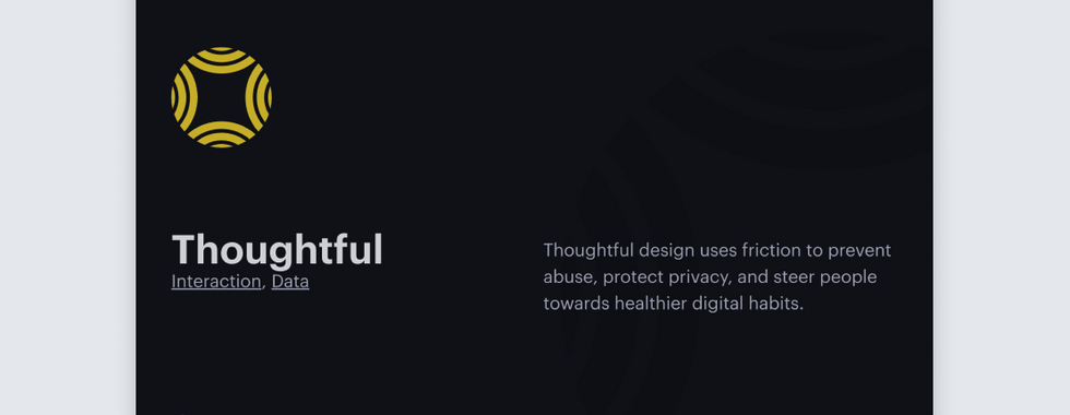 An example of this could be small mechanics, like an autoplay video. Binge watching whole seasons of shows on Netflix isn’t necessarily getting people closer to their goals, or their capabilities as humans—and that was the original vision of what the internet could do. “Empowering” is about giving that power back to the human being, and enabling the user to make conscious decisions about how they choose to let technology shape their own behavior.